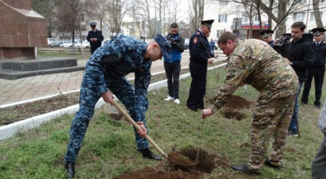 Фото: Пресс-служба МВД по Республике Крым Сотрудники Межмуниципального отдела МВД России «Сакский» высадили саженцы деревьев у памятника погибшим сотрудникам ОВД. «Память о тех сотрудниках, кто пожертвовал самым главным для спасения народа, собственной жизнью, - наш гражданский долг. И мы сделаем все возможное, чтобы об этом помнили не только сотрудники полиции, но и местные жители», - отметил начальник Межмуниципального отдела МВД России «Сакский» майор полиции Дмитрий Стрюков. «5 января 1942 года чтобы отвлечь вражеские силы от осаждённых врагами Севастополя и Керченского полуострова вблизи Евпатории высадился тактический морской десант штурмового батальона. Три дня морские пехотинцы сражались с врагом и отвлекли часть сил противника, что способствовало закреплению успеха советских войск в Крыму. Значительная часть десантников погибла во время штурма города. Позже были расстреляны и попавшие в плен бойцы, а также мирные жители Евпатории, помогавшие освобождать город. В этой схватке принимали участие и сотрудники сакской милиции, которые были включены в состав оперативной группы, напраленной на помощь пехотинцам. Это начальник Сакского отдела внутренних дел Александр Сороковой, начальник паспортного стола Керим Ваниев, оперативные работники Михаил Гасис и Василий Библик. Все они погибли при исполнении своего служебного долга», - сообщили в пресс-службе МВД по Крыму. В честь погибших в 80-ые годы был установлен памятник напротив административного здания Сакского ОВД, у которого традиционно проводятся памятные митинги и строевые смотры личного состава. В год 75-летия Победы в Великой Отечественной войне, по инициативе начальника МО МВД России «Сакский» майора полиции Дмитрия Стрюкова, был создан сквер памяти у памятника погибшим сотрудникам ОВД.