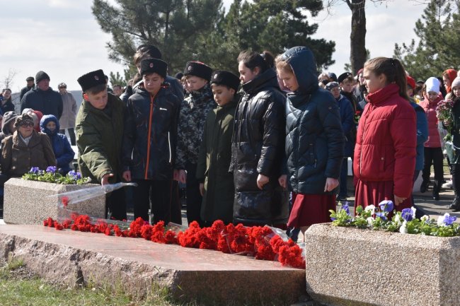 частники акции почтили память погибших минутой молчания и возложили цветы к мемориалу на месте массовых расстрелов в годы Великой Отечественной войны.