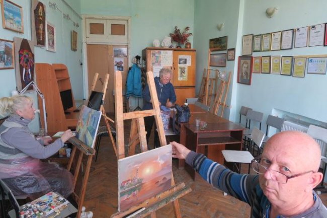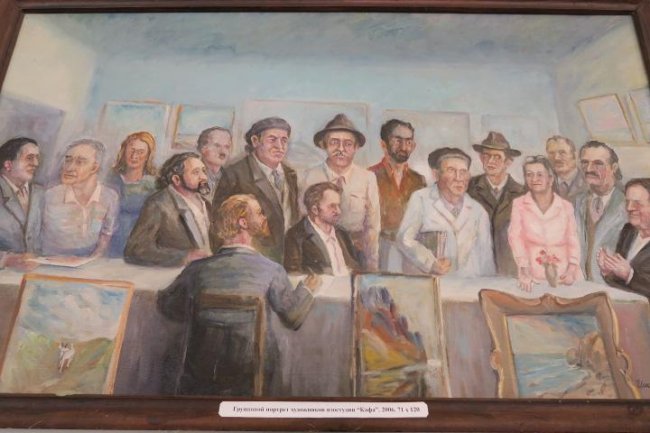 Старейшина коллектива Альфред Цислав (92 года), его работа «Групповой портрет художников изостудии «Кафа» в центе выставочной композиции.