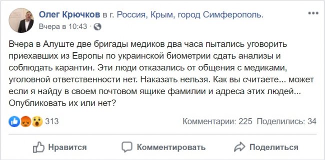 «Во-первых, четыре человека — мама, папа, дети (два года и восемь лет) из Алушты отдыхали в ОАЭ, ездили туда не по биометрии Украины (биометрическим заграничным паспортам Украины — прим.), как указывает журналист, а по российским паспортам! Вылет и прилет в Краснодаре! Во-вторых, прилетели из ОАЭ 16 марта в Краснодар, а не <приехали> из Украины через автомобильный пункт пропуска! Прилетели, когда данная страна не была в списке опасных. Они прилетели одновременно с вице-премьером <Республики Крым> Кивико, только сейчас они — в изоляции принудительной в Феодосии, а Кивико — на совещаниях сидит.
