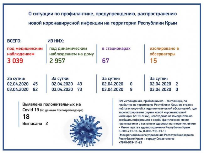 По данным ежедневного мониторинга эпидемической обстановки о случаях выявления новой коронавирусной инфекции (2019-nCov) в Республике Крым среди лиц, прибывающих из зарубежных стран, под медицинским наблюдением находятся 3039 человек. Из них под динамическим наблюдением на дому находится 2957 человек, в стационарах находятся 67 человек, изолировано в обсерваторы – 15 человек. По данным Роспотребнадзора, всего выявлено 18 положительных на Covid-19. Выписано - 2. Лабораторные исследования в Республике Крым по коронавирусу проводятся на базе ФБУЗ «Центр гигиены и эпидемиологии РК и г. Севастополя».
