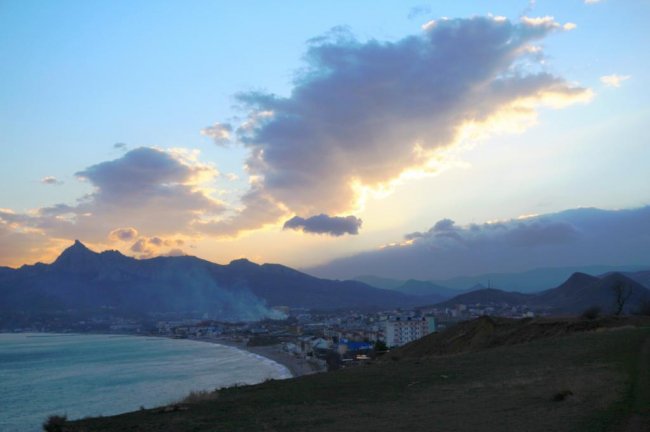 С этого места есть два пути: по дороге из Тихой бухты выйти на трассу в сторону Насыпного или по тропинкам вдоль берега дойти до Коктебеля. На последнем холме в сторону Коктебеля, перед спуском на набережную можно дождаться заката и посмотреть, как солнце окрашивает Карадаг и поселок в золотисто-розовые, а позже сиреневые оттенки.