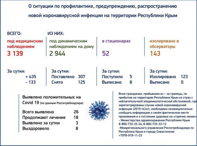 По данным ежедневного мониторинга по сложившейся ситуации с новой коронавирусной инфекцией в Республике Крым, под медицинским наблюдением находятся 3139 человек. Из них под динамическим наблюдением на дому - 2944 человека, в стационарах находятся 52 человека, изолировано в обсерваторы – 143 человека. По данным Роспотребнадзора, всего выявлено 26 положительных на Covid-19. Выписано - 8. Всем гражданам, прибывшим из-за границы, по прибытию на территорию Республики Крым из стран с неблагополучной эпидемиологической обстановкой, где зарегистрированы случаи новой коронавирусной инфекции (2019-nCov), необходимо незамедлительно сообщать информацию о своём фактическом месте проживания и о состоянии здоровья на «горячую линию» Министерства здравоохранения Республики Крым по телефонам 8-800-733-33-34, 8-800-733-33-12 и межрегионального управления Роспотребнадзора по Республике Крым и городу Севастополю по телефону 7978-919-11-23.