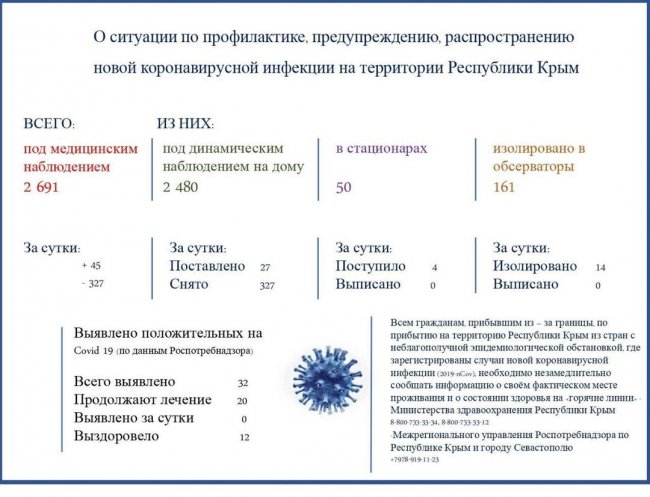 По данным ежедневного мониторинга по сложившейся ситуации с новой коронавирусной инфекцией в Республике Крым, под медицинским наблюдением находятся 2691 человек. Из них под динамическим наблюдением на дому находится 2480 человек, в стационарах находятся 50 человек, изолировано в обсерваторы – 161 человек. По данным Роспотребнадзора, всего выявлено 32 положительных на Covid-19. Выздоровело - 12.