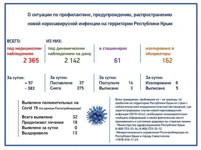 По данным ежедневного мониторинга по сложившейся ситуации с новой коронавирусной инфекцией в Республике Крым, под медицинским наблюдением находятся 2365 человек. Их них под динамическим наблюдением на дому - 2142 человека, в стационарах находятся 61 человек, изолировано в обсерваторы – 162 человека. По данным Роспотребнадзора, всего выявлено 32 положительных на Covid-19. Выздоровело - 13.
