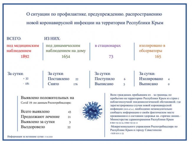 По данным ежедневного мониторинга по сложившейся ситуации с новой коронавирусной инфекцией в Республике Крым, под медицинским наблюдением находятся 1892 человека. Из них под динамическим наблюдением на дому находится 1654 человека, в стационарах находятся 73 человека, изолировано в обсерваторы – 165 человек. По данным Роспотребнадзора, всего выявлено 43 положительных на Covid-19. Выздоровело - 22.