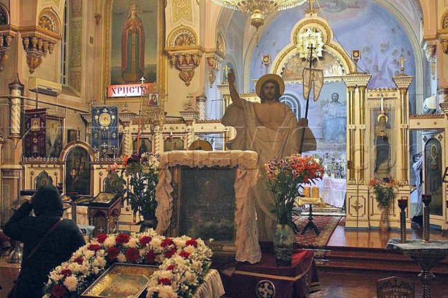 Крестный ход трижды обходит храм. Через открытые двери храма видно, как уносят в алтарь Плащаницу и устанавливают изображение Христова Воскресения. Священники меняют одежды на праздничные – красные.