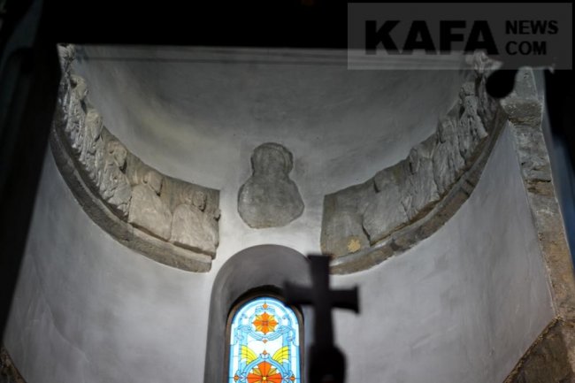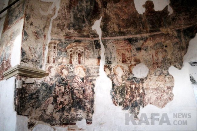 И последний самый удивительный храм на территории Старого города – храм Дмитрия Солунского (в прошлом Святого Стефана). Он расположен на юге, за Рабочим городком и горбольницей. Возле храма находится хорошо сохранившийся армянский фонтан XV века с чистой питьевой водой. Ученые предполагают, что церковь изначально принадлежала греческой общине, внутри обнаружены надписи на греческом языке. Храм Дмитрия Солунского уникален сохранившимися в нем фресками. По мнению большинства ученых и исследователей, авторство фресок принадлежит великому русскому иконописцу Феофану Греку. Сохранилось лишь несколько фрагментов фресок: в алтарной части изображены Иисус Христос с Иоанном Крестителем и Богородицей, Дева Мария с Младенцем, а также сцена Тайной вечери. На западной стене сохранились фрагменты фрески Страшного суда. Даже по этим небольшим остаткам можно оценить мастерство росписи. Фрески сохранились благодаря известковому раствору из негашеной извести, трупов животных, яиц и медуз, который готовился 30 лет в специальных ямах и только потом мастера использовали его в работе. В стены церкви замурованы четыре кувшина, которые создают прекрасную акустику. В 1927 году во время землетрясения в стене алтарной части появилась трещина, проходящая от купола через фигуру Христа. Штукатурка осыпалась вместе с частью фрески. При ремонте трещину заштукатурили. А через некоторое время случилось самое настоящее чудо – на штукатуре проявился лик Христа. Автор репортажа сочла бы это легендой или плодом богатого воображения, если бы не видела образ собственными глазами, когда в храме еще стояли леса реставраторов, и можно было подняться наверх. Лик отчетливо виден и находится именно в том месте, где когда-то был изображен иконописцем.