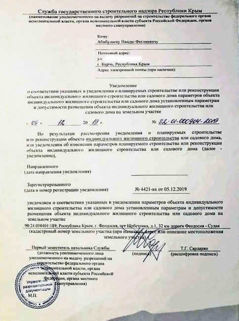 По имеющимся у «Кафы» копиям документов, Служба государственного стройнадзора РК, а именно Первый заместитель начальника Службы Тигран Сардарян, подписали 9 декабря 2019 года некоему Абибулаеву Н.Ф., предпринимателю из Керчи, уведомление № 82-01-000907-2019 о «допустимости размещения объекта ИЖС на земельном участке» кадастровый номер 90:24:050401:189 (внутренний участок 189 на карте – прим.).