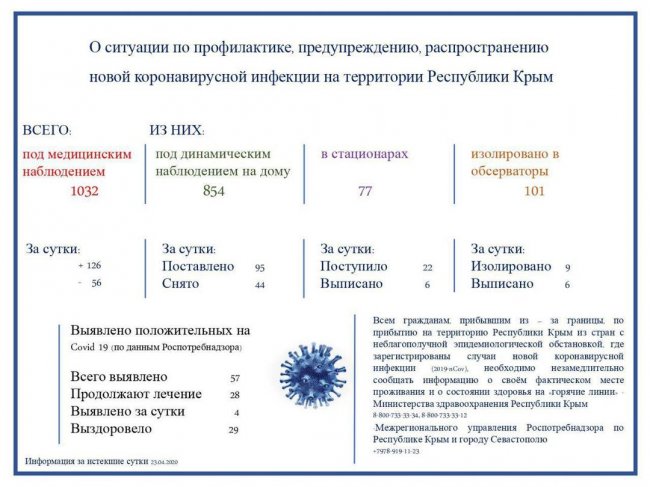 По данным ежедневного мониторинга по сложившейся ситуации с новой коронавирусной инфекцией в Республике Крым, под медицинским наблюдением находятся 1032 человека. Из них под динамическим наблюдением на дому - 854 человека, в стационарах находятся 77 человек, изолировано в обсерваторы – 101 человек. По данным Роспотребнадзора, всего выявлено 57 положительных на Covid-19. Из них на лечении 28 человек, выздоровело - 29.