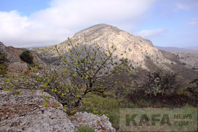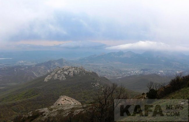 Через некоторое время дорога приводит к развилке: налево - путь к хребту Туар-алан, вниз – к Водяной балке и Щебетовке, а вправо идет тропинка на гору Сандык-кая. По ней и отправимся. Перед подъемом можно передохнуть на поляне, с которой открывается великолепный вид на восток, перед нашими глазами вся горная Киммерия. Полюбовавшись видами, начинаем подъем на самую высокую гору в окрестностях, ее высота 698 метров над уровнем моря. С тюркского Сандык-кая переводится, как «сундук-гора», другое ее название – Каменный лоб, и она, действительно, на него похожа. Подъем легкий и не составит труда. На вершине открывается фантастическая круговая панорама всего Юго-восточного Крыма. На востоке видны Феодосия и залив, гора Клементьева, Коктебель, Карадаг во всей его красе и Отузская долина. Прямо перед нами открывается вид на горный хребет Эчки-даг. На запад, в сторону Караби уходят ряды горных хребтов, а за нашей спиной возвышается величественный Туар-алан и главная гряда Крымских гор.