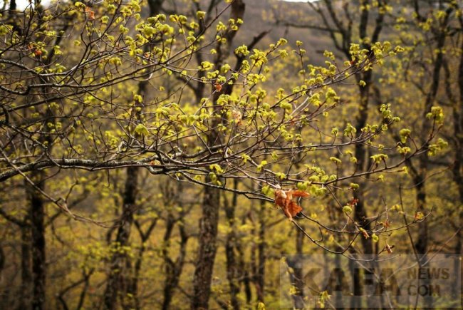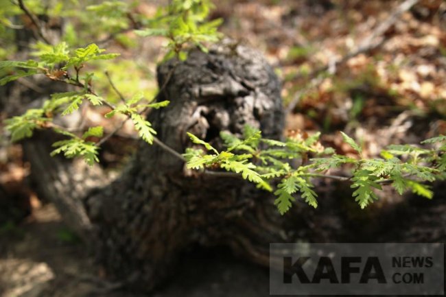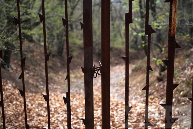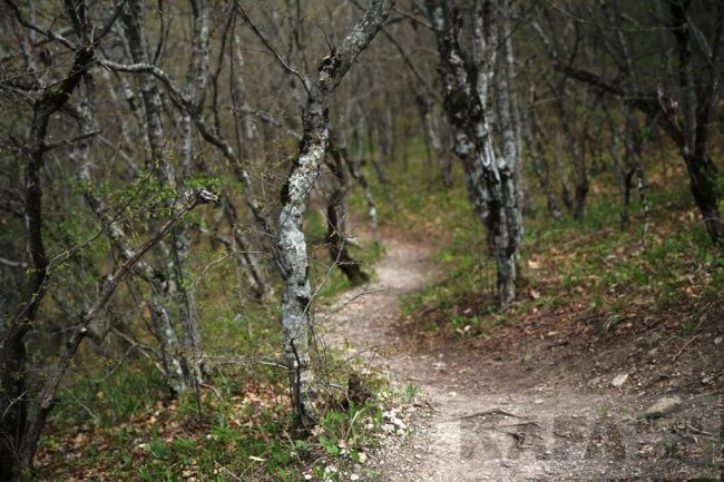 Наш путь начинается в поселке Краснокаменка, откуда по указателям «монастырь» отправляемся горной тропой к Свято-Стефано-Сурожскому монастырю. Под деревьями можжевельника и дуба раскинулись легкие сиреневые ковры зубянки. Середина весны - время цветения орхидей: то здесь, то там выглядывают соцветия ятрышника. По тропе доходим до деревянной церкви на территории монастыря, но вместо привычного маршрута в урочище Хаджи-палом, повернем направо по грунтовой дороге, уходящей вверх и на восток. Дорога идет по левому борту оврага Кызылташ-дере. Вероятно, раньше она была проезжей и связывала монастырь с Отузами (Щебетовкой), но сейчас поперек дороги поставили большие железные ворота, и она понемногу зарастает и превращается в пешеходную тропу. Путь приятный, без тяжелых подъемов. Лес еще полупрозрачен, листья только-только начали распускаться.