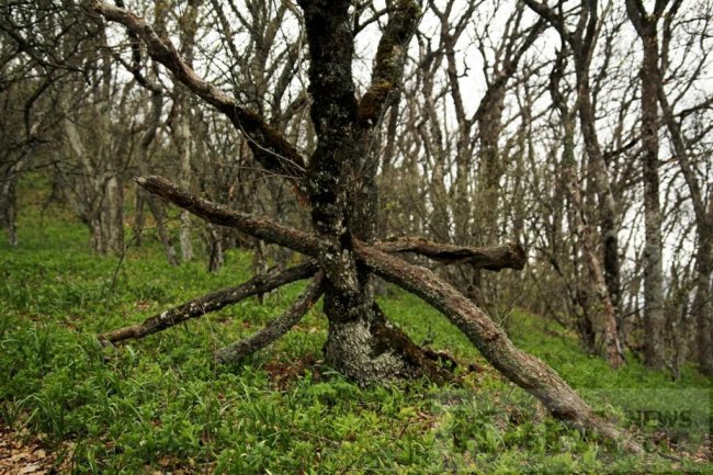 С Сандык-кая спускемся на узкий горный хребет, который как мостик, соединяет вершину с соседней горой Сачарикон-кая («Очищающая от грехов»). Поляны на пути покрыты свечами белой и желтой асфоделины. Еще встречаются пушистые сиреневые цветы сон-травы, а рядом с ними уже зацветают желтые и алые миниатюрные тюльпаны Шренка.