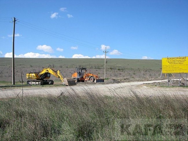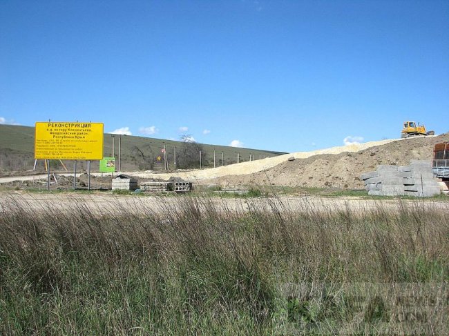 У поворота с трассы Феодосия – Коктебель на гору Клементьева видны стоящие экскаваторы, другая техника. Появился вагончик строителей. Насыпаны большие кучи то ли щебня, то ли отсева с карьера. Видны рулоны гидроизоляционного полотна, которое укладывают при устройстве подушки дороги. Впечатление, что процесс вялотекущий. Можно рассмотреть, что перед вершиной дорогу пробивают по новому маршруту, сместившись левее, склон подрезан метра на два - три.