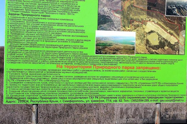 За этим щитом сиротливо зеленеет информационный щит ГАУ УООПТ, сообщающий, что на территории особо охраняемой природной территории «Природный парк регионального значения – Воздухоплавательный комплекс Узун-Сырт, гора Клементьева» запрещены любые земляные работы, кроме связанных с противопожарными мероприятиями и научно-исследовательской работой.