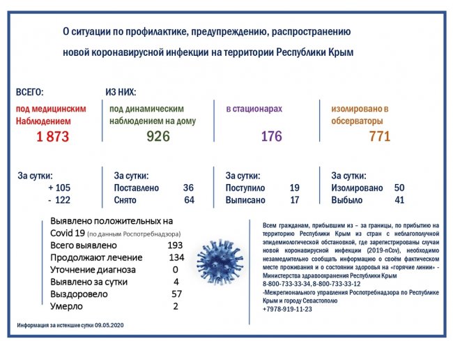 По данным ежедневного мониторинга по сложившейся ситуации с новой коронавирусной инфекцией в Республике Крым, под медицинским наблюдением находятся 1873 человека. Из них под динамическим наблюдением на дому находятся 926 человек, в стационарах находятся 176 человек, изолировано в обсерваторы – 771 человек. По данным Роспотребнадзора, всего выявлено 193 положительных на Covid-19. Из них на лечении 134 человека, выздоровело - 57.