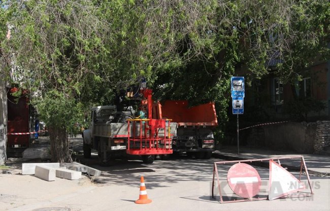 В центре города продолжается ремонт и благоустройство улицы Куйбышева, помимо дорожных работ, рабочие производят обрезку деревьев.