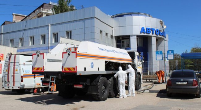 Главным управлением МЧС России в Республике Крым проводились работы по дезинфекции с применением специализированной техники и личного состава, сообщили в пресс-службе ГУП РК «Крымавтотранс».