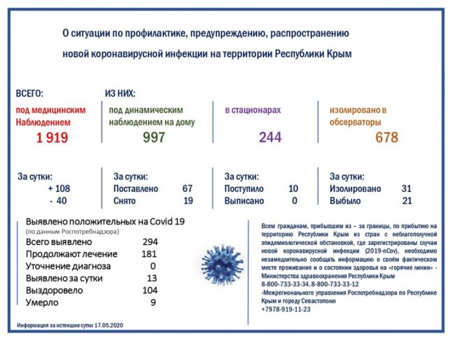По данным ежедневного мониторинга по сложившейся ситуации с новой коронавирусной инфекцией в Республике Крым, под медицинским наблюдением находятся 1919 человек. Из них под динамическим наблюдением на дому находятся 997 человек, в стационарах находится 244 человека, изолировано в обсерваторы – 678 человек. По данным Роспотребнадзора, всего выявлено 294 положительных на Covid-19. Из них на лечении 181 человек, выздоровело - 104.