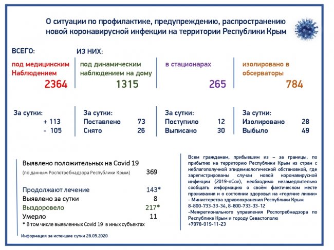 По данным ежедневного мониторинга по сложившейся ситуации с новой коронавирусной инфекцией в Республике Крым, под медицинским наблюдением находятся 2364 человека. Из них под динамическим наблюдением на дому находятся 1315 человек, в стационарах находятся 265 человек, изолировано в обсерваторы – 784 человека. Межрегиональным управлением Роспотребнадзора по Республике Крым и городу Севастополю всего выявлено 369 положительных на Covid-19. Лечение в медицинских учреждениях Республики Крым проходят 143 человека, выписано с выздоровлением - 217.