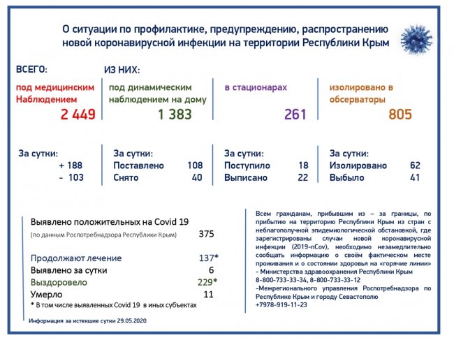 По данным ежедневного мониторинга по сложившейся ситуации с новой коронавирусной инфекцией в Республике Крым, под медицинским наблюдением находятся 2449 человек. Из них под динамическим наблюдением на дому находятся 1383 человека, в стационарах находятся 261 человек, изолировано в обсерваторы – 805 человек. Межрегиональным управлением Роспотребнадзора по Республике Крым и городу Севастополю всего выявлено 375 положительных на Covid-19. Лечение в медицинских учреждениях Республики Крым проходят 137 человек, выписано с выздоровлением - 229.