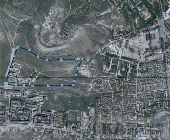 Как указано в документации к торгам, площадь территории ориентировочно составляет 15 га, кадастровый номер квартала 90:24:010110. Территория частично занята существующей застройкой. На прилагаемой в документах карте новый квартал обозначен, и находится, снова-таки, прямо у подножия Лысой горы.