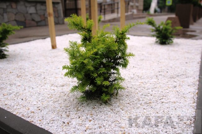 Вдоль фасада магазина появились клумбы в виде каменных тумб. На клумбы посадили два дерева катальпы на штамбе, кустики тиса ягодного и туи. Катальпа – декоративное дерево, которое часто используют в городском озеленении. Дерево имеет округлую крону, покрытую крупной сердцевидной листвой. Цветет катальпа в начале лета, цветки с нежным ароматом собраны в крупные пирамидальные соцветия. Ближе к осени дерево покрывается плодами в виде длинных свисающих стручков. Грунт в клумбах засыпали белой мраморной крошкой, на фоне которой яркая зелень выглядит особенно декоративно. У памятника броненосцу «Потемкин», на клумбах перед зданием МФЦ свежая садовая земля. Вероятно, и с этой стороны магазина скоро появятся новые зеленые насаждения.