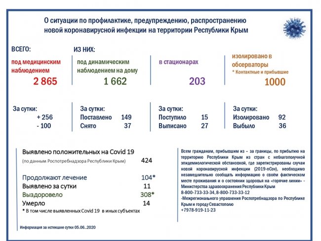 По данным ежедневного мониторинга по сложившейся ситуации с новой коронавирусной инфекцией в Республике Крым, под медицинским наблюдением находятся 2865 человек. Из них под динамическим наблюдением на дому - 1662 человека, в стационарах находятся 203 человека, изолировано в обсерваторы – 1000 человек. Межрегиональным управлением Роспотребнадзора по Республике Крым и городу Севастополю всего выявлено 424 положительных на Covid-19. Лечение в медицинских учреждениях Республики Крым проходят 104 человека, выписано с выздоровлением - 308.