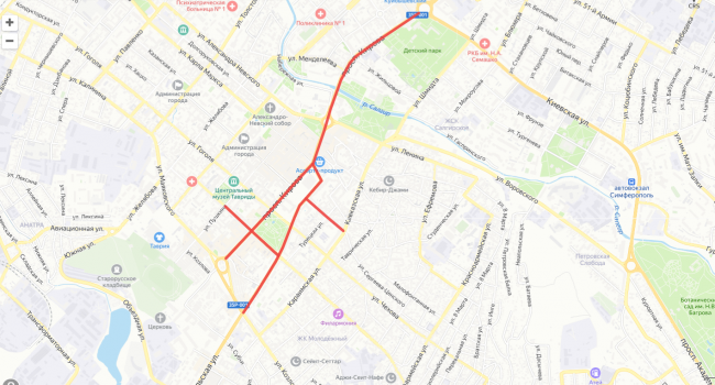 - по улицам Киевская, Шмидта, Пролетарская, Кавказская, Караимская (маршруты №№: 1 А-Б, 2 ,3, 6, 7, 8, 12 А-Б, 15, 25, 30, 41, 49, 50, 52, 54, 55, 63, 69, 70, 78, 81 , 91, 94, 96, 98);
