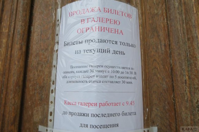 Обилечивание посетителей здесь ограничено, билеты продаются только на текущий день. Вход и выход из главного корпуса галереи разведены по разным местам. По информации, полученной «Кафой» от сотрудников галереи, посещаемость в первый день работы максимально возможная в соответствии с объявленными условиями.