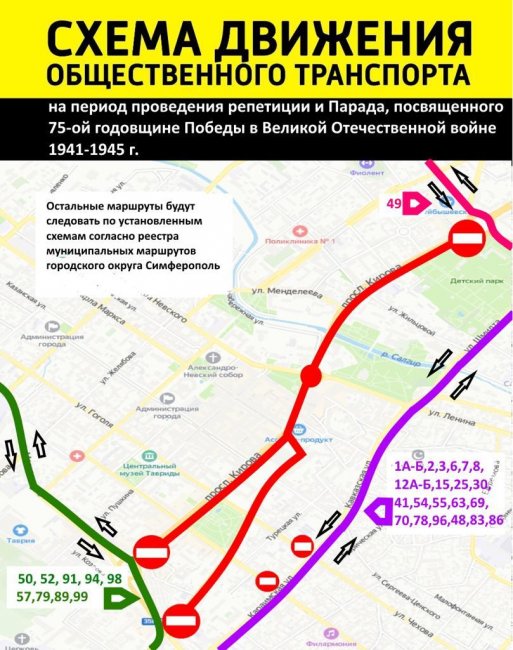 В Симферополе 18 июня с 18:00 до 22:00 и 20 июня с 08:00 до 13:00 будет перекрыто движение транспорта в связи с проведением репетиции Парада Победы в Великой Отечественной войне 1941-1945 годов. Так, движение будет ограничено на участке от пл. Амет-Хан Султана до пл. Куйбышева включительно; по улице Севастопольской (на участке от перекрестка ул. Севастопольской и ул. Козлова до пересечения ул. Севастопольской и пр. Кирова); улицам Турецкая (в районе пересечения с улицей С. Ценского) и Пушкина (в районе пересечения с ул. Самокиша). В указанный период времени на данных участках будет запрещена парковка транспортных средств, также будет организовано дежурство машины эвакуатора. На время проведения репетиции изменится схема движения транспорта и маршрутных транспортных средств. Движение общественного транспорта будет осуществляться: - по улицам Киевская, Шмидта, Пролетарская, Кавказская, Караимская (маршруты: 1 А-Б, 2 3, 6, 7, 8, 12 А-Б, 15, 25, 30, 41, 49, 50, 52, 54, 55, 63, 69, 70, 78, 81, 91, 94, 96, 98); - по улицам Павленко, Маяковского (маршруты: 1 А-Б, 4, 12 А-Б, 52, 59, 60, 61, 62, 67, 81, 98). По остальным маршрутам движение автобусов будут осуществляться согласно установленных схем движения. Также подготовлена схема объезда общественного транспорта на период проведения репетиции и парада:
