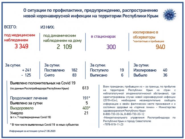 По данным ежедневного мониторинга по сложившейся ситуации с новой коронавирусной инфекцией в Республике Крым, под медицинским наблюдением находятся 3349 человек. Из них под динамическим наблюдением на дому находятся 2109 человек, в стационарах находятся 300 человек, изолировано в обсерваторы – 940 человек. Межрегиональным управлением Роспотребнадзора по Республике Крым и городу Севастополю всего выявлено 613 положительных на Covid-19. Лечение в медицинских учреждениях Республики Крым проходят 191 человек, выписано с выздоровлением - 403.