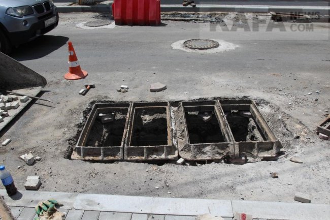 В понедельник 22 мая на улице напротив школы №19 рабочие занимались ремонтом и заменой ливневых решеток. Поврежденные решетки заменяли на новые, а старые переустанавливали, с учетом запланированного уровня дорожного покрытия. В открытых ямах видны различные участки труб. "Врезки" это или законные коммуникации – разбираться компетентным службам.