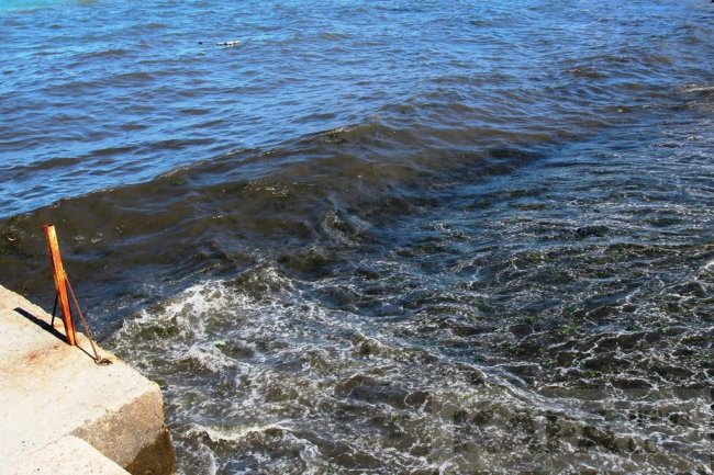 Морская вода в районе первого переезда, в месте слива городской ливневой канализации имела явный грязно-коричневый цвет. На поверхности отчетливо видна граница между относительно чистой и грязной водой. При этом на пляже «Камушки» купались отдыхающие с детьми, и нигде не было видно предупреждения или запрета на купание.