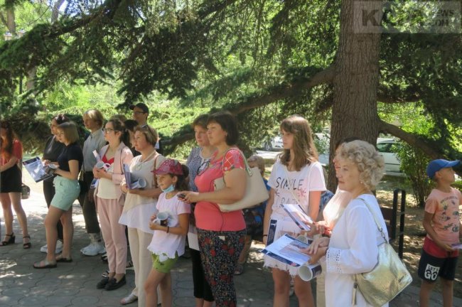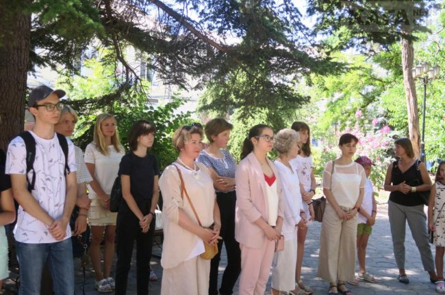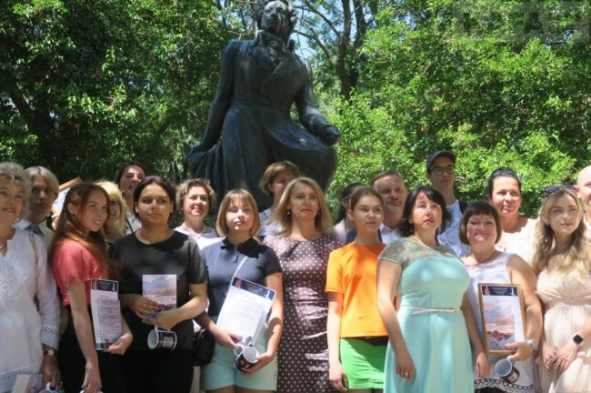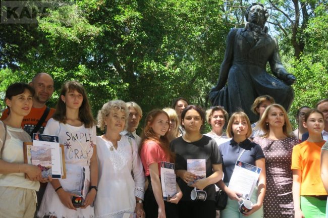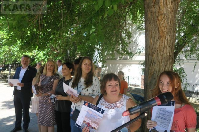 Маршрут «Феодосия литературная» - от пятой городской гимназии: преподаватели Юлия Сабадаш, Анжелика Шемечко и учащаяся Мария Шнуркова.