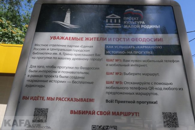 В День молодежи, 27 июня в феодосийском пушкинском сквере состоялось праздничное мероприятие, основой которого стала презентация мобильных аудиогидов, появивашихся в рамках федеральной программы «Культура малой Родины». В нашем городе имя проекта - «Точка доступа – Феодосия». Это совместное детище местного отделения партии «Единая Россия» и центральной городской библиотеки имени Грина, носящее название «Философия города – историческое пространство. Точка доступа – библиотека».