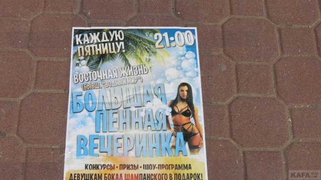 И есть реклама, наклеенная вот прямо на плитку набережной