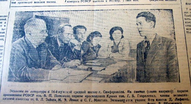 его вопросы, когда присутствовал на экзаменах в крымских школах. В архиве газеты сохранился снимок Леонида Яблонского, запечатлевший экзамен по литературе в 14-й мужской средней школе Симферополя. «На снимке (слева направо) нарком просвещения РСФСР тов. В. П. Потёмкин, нарком просвещения Крыма тов.