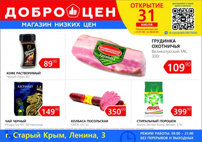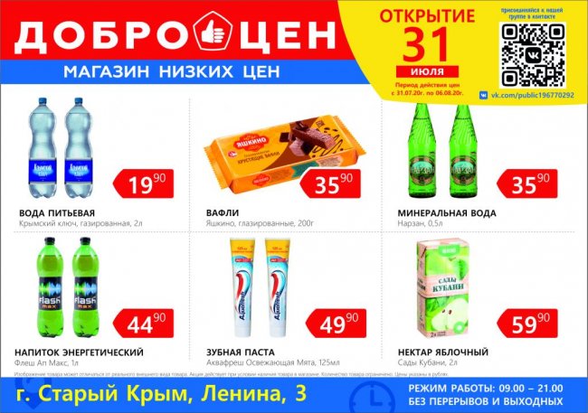 31 июля состоится праздничное открытие магазина «Доброцен» в Старом Крыму. Магазин будет открыт для всех покупателей с 9 до 21, без перерывов и выходных по адресу: г. Старый Крым, ул. Ленина, 3