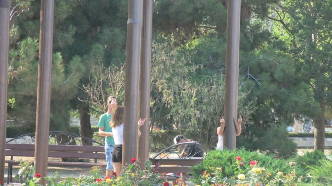Молодые люди, которые вылавливают деньги из отдыхающих, на скамеечке за ними. Когда они увидели, что я их фотографирую, они дружно показали нам всем факи: не дождетесь, типа, не справится с нами ни полиция, ни администрация. И похоже, они правы.