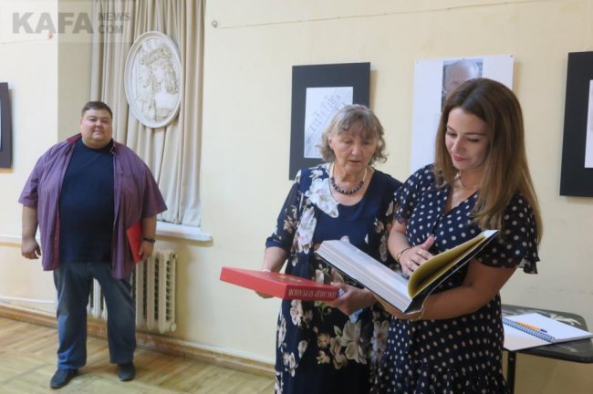 Лариса Сергеевна передала приветствие феодосийским ценителям изобразительного искусства от юбиляра, показав его видеообращение и фильм о творчестве Александра Бурганова. В дар музею были переданы альбомы и книги от Александра Николаевича, книжные подарки от художника получила и центральная городская библиотека.