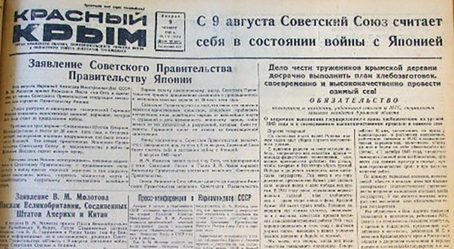 9 августа 1945-го наша газета сообщила о новой войне. Фото автора. 75 лет назад всего 3 месяца отделяло Советский Союз от долгожданного выстраданного мира до новой кровопролитной войны. 9 мая 1945-го - День Победы в Великой Отечественной, когда огромными усилиями, мужеством, жертвами наши люди разгромили германских фашистов и их приспешников. Ещё продолжались в том мае несколько дней бои в Чехословакии, где местная группировка отказывалась капитулировать, ещё погибали наши солдаты, но Победа уже была, официально война окончилась. И спешили в Союз эшелоны с демобилизованными, победителями… 9 августа 1945-го - новая война, наша Вторая мировая, с японскими милитаристами. Страны-союзницы по антигитлеровской коалиции - Великобритания, США, а также Китай не могли самостоятельно справиться с агрессором. И СССР, как всегда, пришёл на помощь. «С 9 августа Советский Союз считает себя в состоянии войны с Японией». Эти строки в четверг, 9 августа 1945-го, опубликовала и наша газета, «Красный Крым». Верные слову Накануне Народный комиссар иностранных дел СССР Вячеслав Молотов «принял японского посла господина Сато и сделал ему от имени советского правительства заявление для передачи правительству Японии: «После разгрома и капитуляции гитлеровской Германии Япония оказалась единственной великой державой, которая всё ещё стоит за продолжение войны. Требование трёх держав - Соединённых Штатов Америки, Великобритании и Китая о безоговорочной капитуляции японских вооружённых сил было отклонено Японией. Тем самым предложение японского правительства Советскому Союзу о посредничестве в войне на Дальнем Востоке теряет всякую почву. Учитывая отказ Японии капитулировать, союзники обратились к правительству СССР с предложением включиться в войну против японской агрессии и тем самым сократить сроки окончания войны, сократить количество жертв и содействовать скорейшему восстановлению всеобщего мира. Верное своему союзническому долгу, советское правительство приняло предложение. Советское правительство считает, что такая его политика является единственным средством, способным приблизить наступление мира, освободить народы от дальнейших жертв и страданий и дать возможность японскому народу избавиться от тех опасностей и разрушений, которые были пережиты Германией после её отказа от безоговорочной капитуляции. С 9 августа Советский Союз считает себя в состоянии войны с Японией». Точно такое же заявление в Токио наш посол Яков Малик передал японскому правительству. А в Москве нарком встретился ещё и с Кларком Керром Арчибальдом, послом Великобритании, Уильямом Авереллом Гарриманом, послом США, и Фу Бинчаном, послом Китая, они «выразили удовлетворение заявлением советского правительства». Одобрение выражали и простые граждане - «Японский агрессор будет разгромлен» - такие заявления принимались на митингах. К примеру, коллектив Симферопольского кожобувного комбината имени Дзержинского «единодушно решил стахановским трудом помочь Красной Армии совместно с армиями союзников быстрее обуздать Японию». Рабочие консервного завода имени 1-го Мая в Симферополе также были единодушны. От имени всех высказался стахановец товарищ Коновалов: «Отечественная война показала, что фронт и тыл были едины в своей решимости довести дело разгрома гитлеровской 