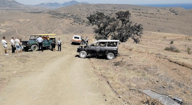 Фото с сайта пресс-службы МВД по Республике Крым. Сотрудники полиции устанавливаются обстоятельства дорожно-транспортного происшествия, произошедшего в районе горы Меганом под Судаком. Об этом сообщила пресс-служба МВД. По информации ведомства, 27-летний водитель внедорожника УАЗ превысил скорость, не справился с управлением при подъеме на гору, в результате чего автомобиль опрокинулся. В результате ДТП пассажиры выпали из автомобиля, имеющего открытый кузов, при этом одна из женщин получила телесные повреждения в виде переломов. «Сотрудниками полиции установлено, что водитель оказывал услуги по перевозке людей без соответствующих документов, без проведения необходимых проверок и получения разрешений. Вместе с тем, законодательством установлен ряд требований к хозяйствующим субъектам, оказывающим транспортные услуги, в том числе по организации экстремального отдыха» - говорится в сообщении.