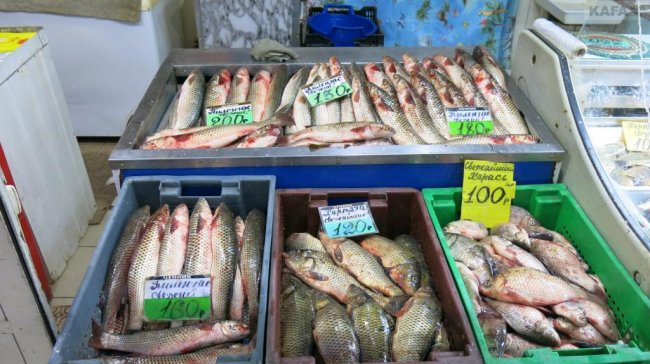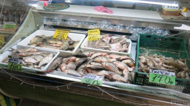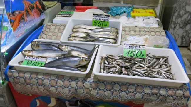 В рыбном ряду бычка продают по 170 руб., ската - по 150 руб, леща - по 120 руб., хамсу - по 150 руб., карпа по 230 руб., пиленгаса - от 130 до 200 руб., керченскую селедку по 250 руб.