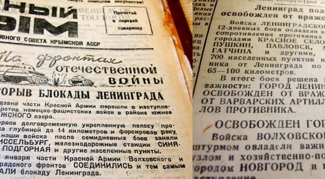 Наша газета о прорыве блокады в 1943-м и снятии её в 1944-м. Автора. Потемневшая от времени четвертушка нынешнего размера газетного листа: номер «Красного Крыма» (как с 1920-го по 1952-й называлась «Крымская правда») за 28 января 1944 года, пятница, «Прочитай и передай товарищу!». На первой полосе призыв уничтожать немецких злодеев, «распоясавшихся в Крыму вовсю» - к началу года наши войска уже заняли первые плацдармы на полуострове, враг, чувствуя скорую погибель, стремился уничтожить как можно больше крымчан. Рядом рассказ о московском торжественно-траурном заседании, посвящённом 20-й годовщине со дня смерти Владимира Ильича Ленина. И два сообщения Совинформбюро - одни из самых долгожданных в войну. «Войска Ленинградского фронта в итоге 12-дневных боёв овладели важнейшими узлами сопротивления противника под Ленинградом: городами Красное Село, Ропша, Урицк, Пушкин, Павловск, Мга, Ульяновка, Гатчина и другими, освободили более 700 населённых пунктов и отбросили противника от Ленинграда по всему фронту на 65-100 километров. В итог боёв решена задача исторической важности: город Ленинград полностью освобождён от вражеской блокады и от варварских артиллерийских обстрелов противника». Это случилось 27 января, а неделей раньше - «Войска Волховского фронта 20 января штурмом овладели важным железнодорожным узлом и хозяйственно-политическим центром городом Новгород и продолжают развивать наступление». Прошло чуть больше года с другой опубликованной в газете сводки: «Недавно части Красной Армии перешли в наступление против немецко-фашистских войск в районе южнее Ладожского озера. Прорвав долговременную укреплённую полосу противника глубиной до 14 километров и форсировав реку Нева, наши войска после семидневных боёв заняли Шлиссельбург, железнодорожные станции Синявино, Подгорная и другие населённые пункты. С 18 января части Красной Армии Волховского и Ленинградского фронтов соединились и тем самым прорвали блокаду Ленинграда». Войсками Волховского фронта тогда командовал Кирилл Мерецков, Ленинградского - Леонид Говоров. Патриот России и любимого города на Неве Ирина Богданова в пронзительной книге о блокаде и людях «Мера бытия» описывает ту первую встречу разведчиков обоих фронтов у Старо-Ладожского канала. «Когда на бровке канала мелькнули неясные фигуры, взвод старшего сержанта Кириченко (Георгия Ивановича,1915 года рождения. - Ред.), 284-го полка Ленинградского фронта, рухнул в снег и двинулся вперёд по-пластунски, готовый умереть, но не пропустить фашистов дальше. Но выстрелов не последовало. Никто не двигался. «Наши? Волховский фронт?» - неуверенным голосом произнёс кто-то из разведки. «Наши? Ленинградский фронт?» - спросили их с другой стороны. И тогда взвод начал вставать с колен, двумя руками вздымая над головой автоматы. Шедшие навстречу тут же повторили условный жест, бывший первой частью пароля. Два фронта встретились, проклятая блокада была прорвана. Ошалев от восторга, охрипший хор мужских голосов одним дыханием проорал окончание пароля, переданного войскам из штаба фронтов: «Победа!» В январе 1943-го она была ещё не полная, но такая долгожданная, облегчающая, оплаченная тысячами жизней и на двух фронтах, и в Ладожской военной флотилии, и в пригородах, и в самом Ленинграде. Потом был январь 1944-го и вновь Ленинградская «Победа!». В январе 
