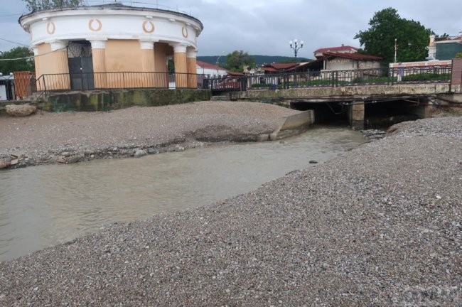 Городская ливневка, стекающая в море прямо под железнодорожным переездом у насосной станции, бурлит, грозно шумит и едва справляется с потоками воды. Море рядом с потоками мутной жижи, стекающей из города, выглядит точно так же, как и сама городская ливневая канализация. Оно грязное, бурое, полное глины. Купаться в этой части пляжа явно не стоит.