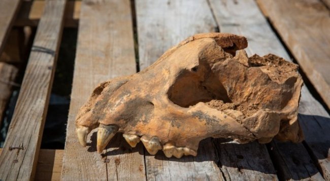 Ученые КФУ и Российской академии наук нашли в пещере «Таврида» почти полностью сохранившийся череп ископаемой гигантской гиены пахикрокуты.