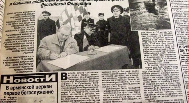 Произошло это в памятную для России дату - День Конституции. Тогда наша газета вместе с полуостровом была в составе Украины, а потому подписание стало для многих сенсацией - «газета одного государства шефствует над кораблём иного?!». Но для коллектива «Крымской правды» это было естественно: во-первых, мы не считали Россию «другим государством», боролись, чтобы вернуться «в родную гавань».
