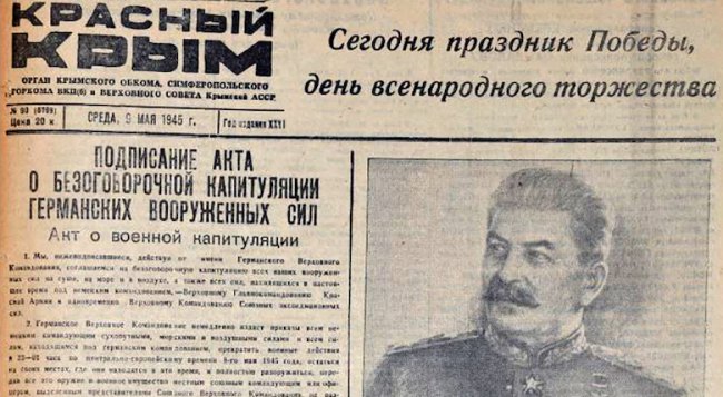 Символом той Победы стало поднятое над рейхстагом 30 апреля 1945-го Мелитоном Кантария, Михаилом Егоровым и Алексеем Берестом Красное знамя. Тогда было не до фото - шли бои, а 2 мая, когда Берлин взяли, фотокорреспондент Евгений Халдей с помощью фронтовиков Алексея Ковалёва, Абдулхакима Исмаилова и Леонида Горичева сделал знаменитый снимок. Он привёз свой флаг и ещё два (один бойцы установили на аэродроме Темпельгоф, второй - Кузьма Дудеев и Иван Андреев подняли над Бранденбургскими воротами) для победного кадра из Москвы - красные скатерти дал завхоз ТАСС Григорий Любинский, звезду, серп и молот из белого материала вырезал сам, а сшил полотнища бывший симферопольский портной Израиль Кишицер.