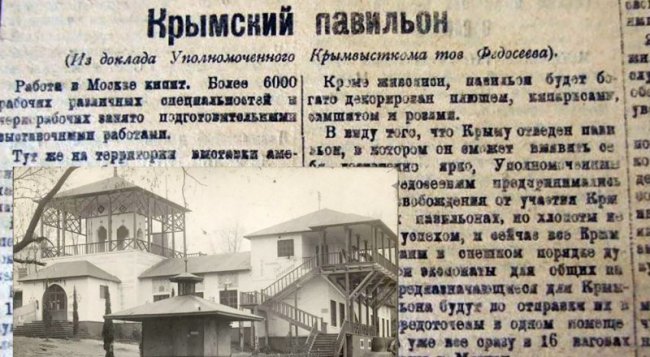 Наша газета, тогда «Красный Крым», направила на выставку, призванную не только показать достижения страны, но и познакомить народы СССР друг с другом, стать школой для крестьян, специального корреспондента Н. Бурлака (увы, имя уже не узнать). Он писал о ней, как об одном из «чудес Советской власти». «Крым будет представлен и в общем отделе, и в собственном павильоне», который полуостров строит на свои деньги по проекту Матвея Гинзбурга, удобное место выбрано - вблизи вокзала, соединяющего территорию выставки с окружной железной дорогой. О строительстве докладывал уполномоченный Крымвыставкома товарищ Феодосеев, а наша коллега Е. Бурмакина писала, что экспонаты для Крымского павильона «в 16 вагонах отправлены в Москву». «Изображающий Бахчисарайский дворец художественно расписанный павильон декорирован плющом, кипарисами, самшитом и розами. Работами по отделке руководили художники Константин Богаевский и Усеин Боданинский». «Не успевший оправиться от хозяйственной разрухи, от последствий недорода и голода Крым сделал всё, чтобы занять достаточное место на Всесоюзной выставке». На неё привезли чудом сохранённые крымские спецкультуры и чистокровных, необыкновенно выносливых, лошадей крымской породы, уникальные кустарные изделия татарок бахчисарайской школы. Очевидцы вспоминали, что отбор экспонатов спецкомиссия проводили тщательно, только лучшие: «шерсть, каракуль, лекарственные травы, карты и статистические материалы, табак, табачные изделия, вино, фрукты в сыром и сушёном виде, хлеб в зерне, виноград, кроличьи шкурки, модели плодосушилок и типичной татарской сельхозусадьбы на Южном берегу, баранов, продукцию местных консервных фабрик, рыбопромышленности, мыловарения, молочного хозяйства и многое другое. Профессором Николаем Самокишем исполнена большая масляными красками картина «Голод в Крыму».